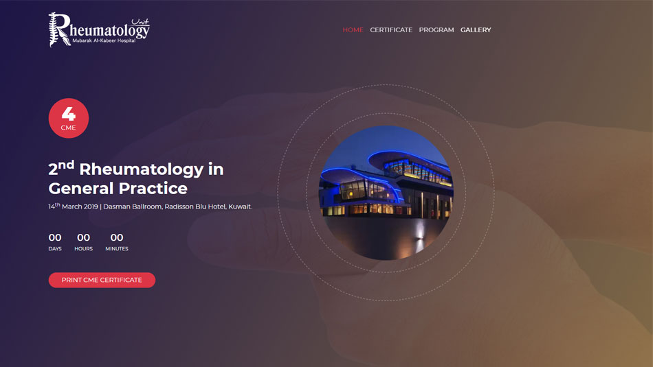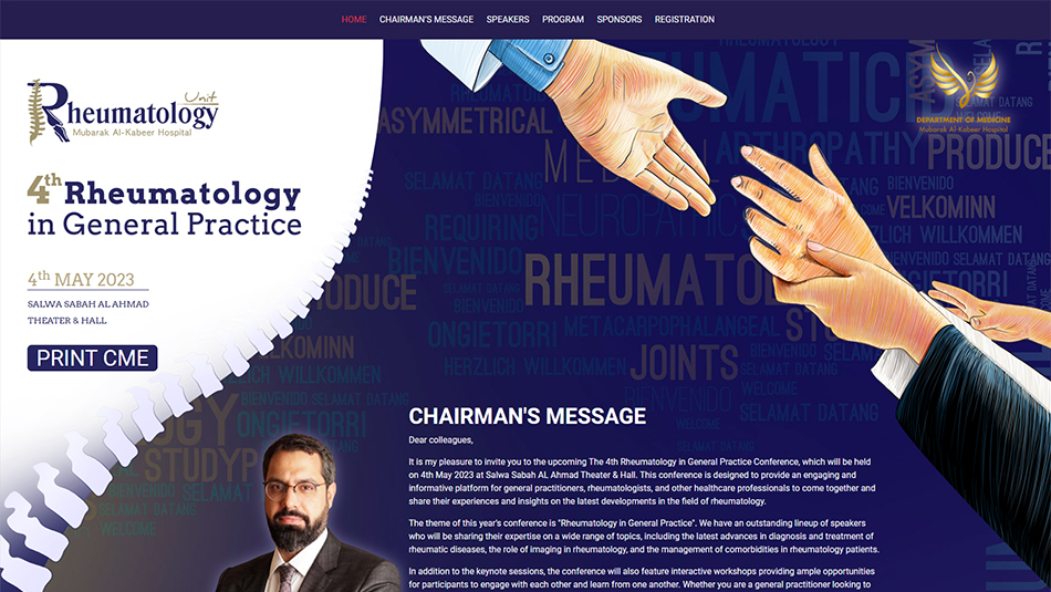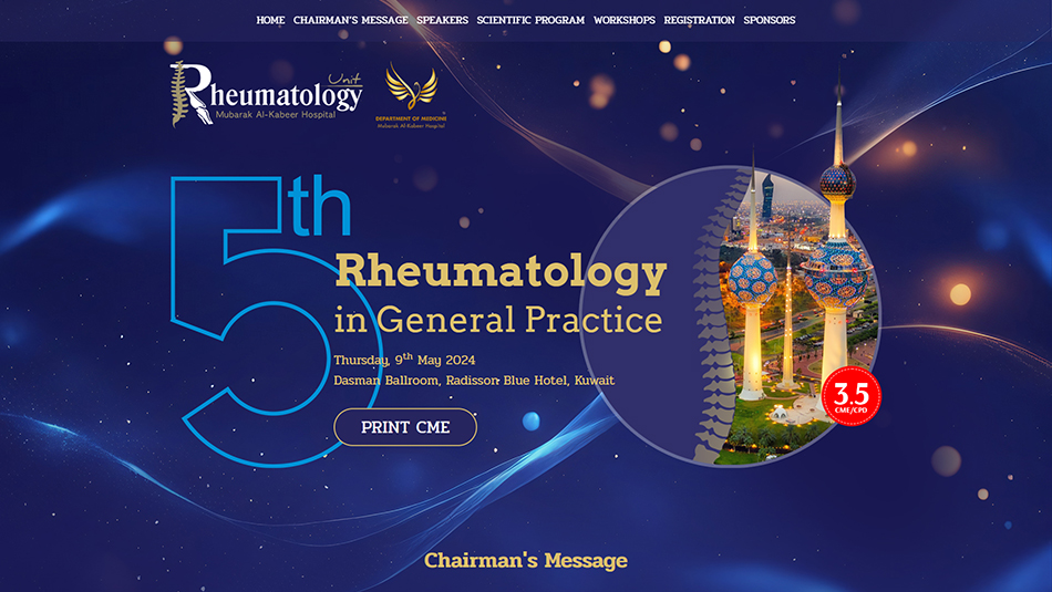 It is my pleasure to invite you to the upcoming The 6th Rheumatology in General Practice Conference, which will be held on 22nd May 2025 at Salwa Sabah Al-Ahmad Theater, Kuwait. This conference is designed to provide an engaging and informative platform for general practitioners, rheumatologists, and other healthcare professionals to come together and share their experiences and insights on the latest developments in the field of rheumatology.