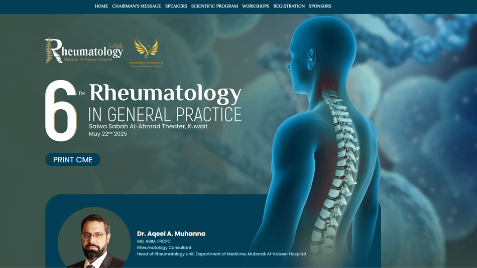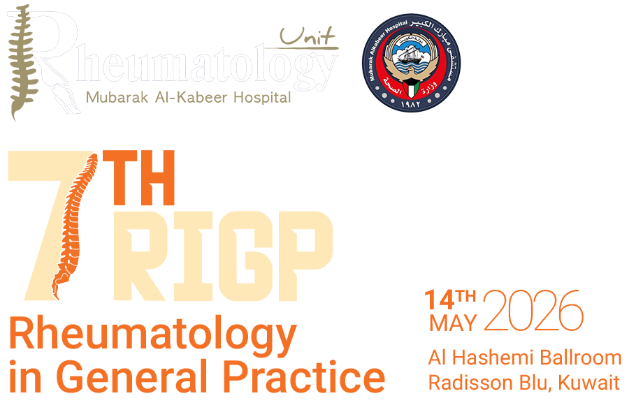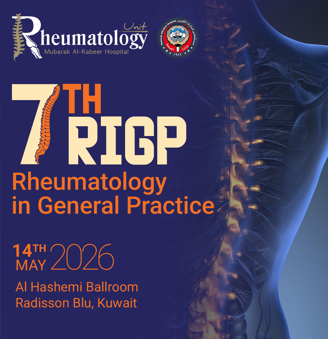 It is my pleasure to invite you to the upcoming The 7th Rheumatology in General Practice Conference, which will be held on 14th May 2026 at Al Hashemi Ballroom, Radisson Blu, Kuwait. This conference is designed to provide an engaging and informative platform for general practitioners, rheumatologists, and other healthcare professionals to come together and share their experiences and insights on the latest developments in the field of rheumatology.